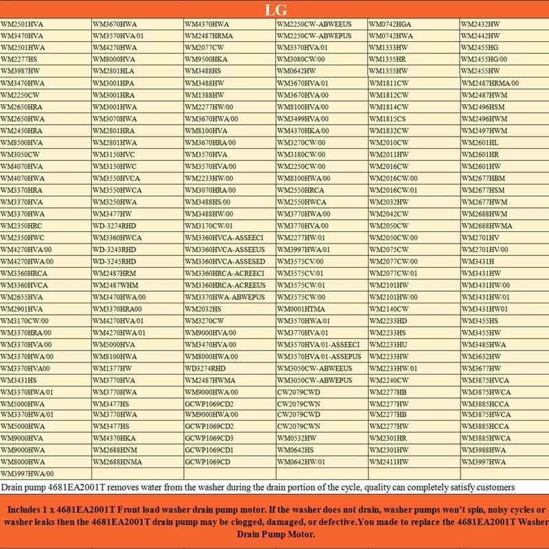 - ใ๐ฃ๐๐๐๐๐๐ ๐๐ก๐๐๐จ๐๐๐ฆใ1 x Lg washer drain pump 4681EA2001T AP5328388 removes water from the washer during the drain portion of the cycle. 4681EA2001T front load washer drain pump motor can make the dryer work more quietly. 4681EA2001T washer drain pump motor can solve the following problems: โ Washer will not drain โกWasher pumps wonโt spin โขNoisy cycles โฃWasher leaks. Youโll just need disconnect the power and water supply. Use a Phillips screwdriver, locking pliers, needle nose pliers, towel, and small flathead screwdriver etc tools. Only takes 30 to 60 minutes to complete on your own, which will save you maintenance costs and labor costs.