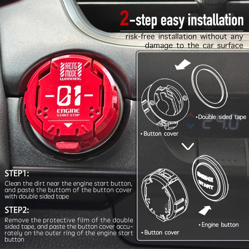 - โ ใ๐ฎ-๐ฆ๐๐ฒ๐ฝ ๐๐ฎ๐๐ ๐๐ป๐๐๐ฎ๐น๐น๐ฎ๐๐ถ๐ผ๐ปใJust tear off one side of the double-sided tape and paste it to the bottom of the button cover, and then tear off the other side of the double-sided tape and paste it on the outer ring of the engine start button accurately. Please clean the dirt near the car button before installation. (The second-generation non-marking double-sided tape does not leave any traces when removed)