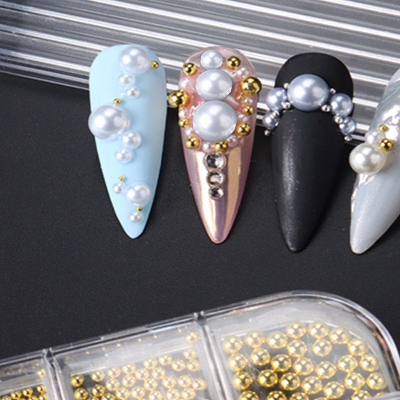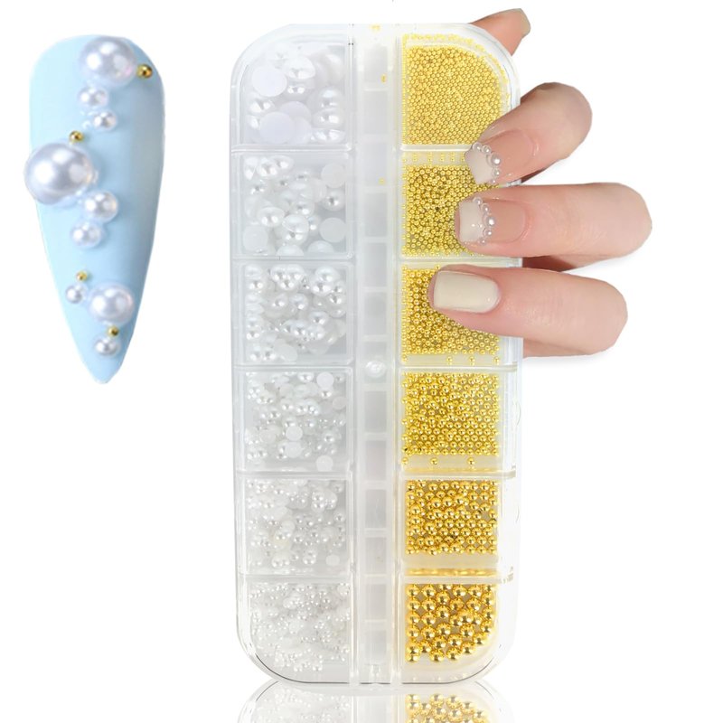 - 【1 Boxes/12 Grids Nail Pearls Nail Charms & Caviar Beads For Nails Charms】Metal caviar beads multi-sized and pearls for nails charms for nails design, white nail art flat back half round pearls for crafting nail jewels. Enough amounts and size options for your daily work, go out or other nail decorations purposes.