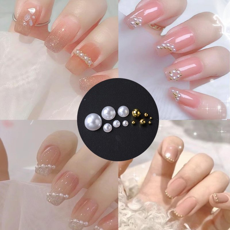 You will receive 1 box of flat back pearls for crafting and gold small metal beads,which in various size that are appropriate for the majority of real or fake nails. They can be used to create original nail art.