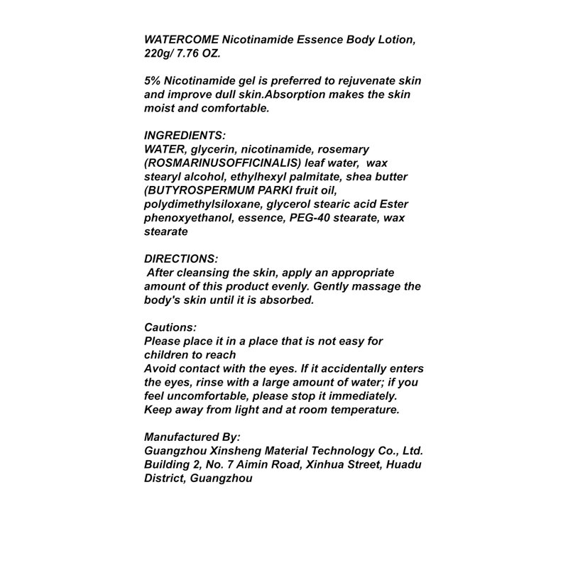 1 PC Watercome Perfumed Nicotinamide Even Skin Complexion Silky Essence Body Lotion, Smoothing Softening Skin, Leaving Smooth And Moist Skin For You, 220g. (W tea)