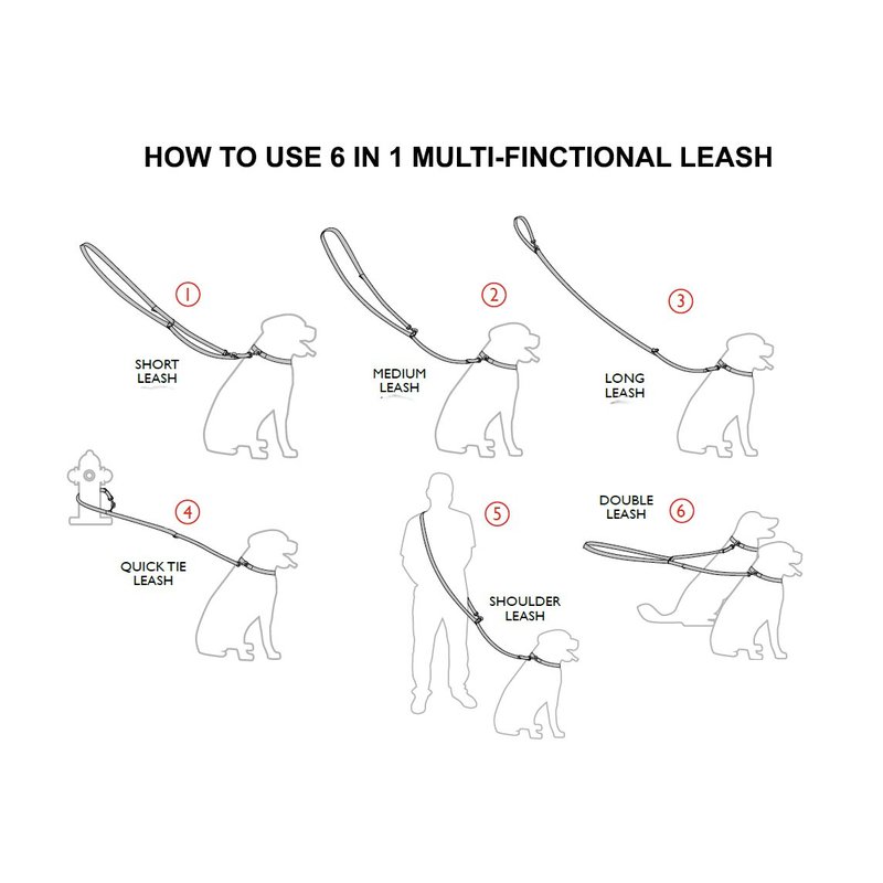 Six way European leashes have been popular with dog obedience trainers, professional handlers, police K9 trainers around the world for years. This Classic Adjustable Dog Leash is designed to make walking your dog or running with your dog easy! Perfect for walking with any dog, you can easily adjust the length of this leash to make sure you and your pet are always comfortable. Six Functions in One Versatile Leash! This size is most suitable for large and extra large breeds. This size is most suitable for Large and X-Large dogs.