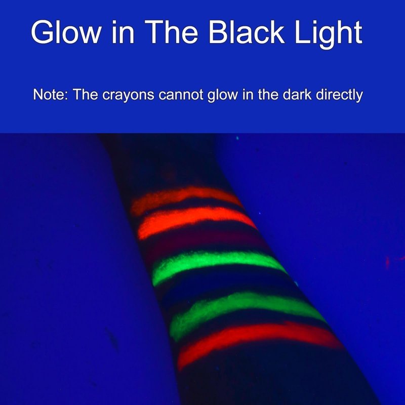 - Glow In The Black Light Paint:these glow in the dark face paint will glow brightly under ultraviolet light or black light.they will make you shine and dazzling in the dark. But face paint cannot glow in the dark directly.Our Neon glow face paint kit was special designed for kids and adults.