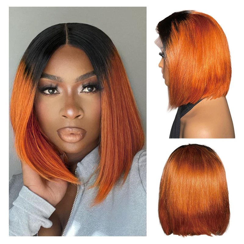 10 inch 1b/350 Straight Bob Wig Human Hair, Lace Glueless Front Wigs Human Hair,highlight human hair bob wig,Pre Plucked 13x4 HD Lace Front Wigs Human Hair 180% Density Orange and Black Wig Human Hair