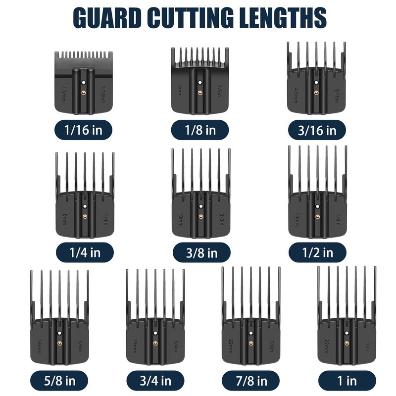 - You will get 10 guards that enable you trim different length of hair as you want. Cutting lengths: 1/16” 1/8” 3/16” 1/4” 3/8” 1/2” 5/8” 3/4” 7/8” 1”. You'll always get the right clipper guard to suit your styling needs.