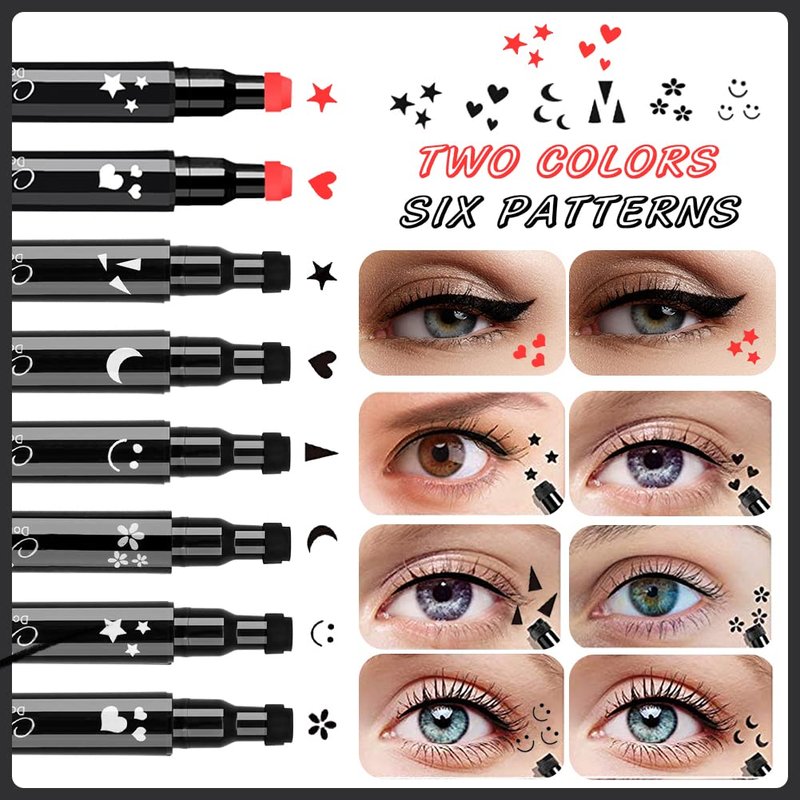 - 【Package Includes】 You will get 6 different shapes liquid eyeliner stamp in black color, 2 red eyeliner stamp in heart and star shapes, and 2 eyebrow pencils with a pencil sharpener in this eyeliner set. The eyeliner stamps comes with Heart/Flower/Moon/Star/Smiley /Triangle shapes to create your charming and personalized cat eye.