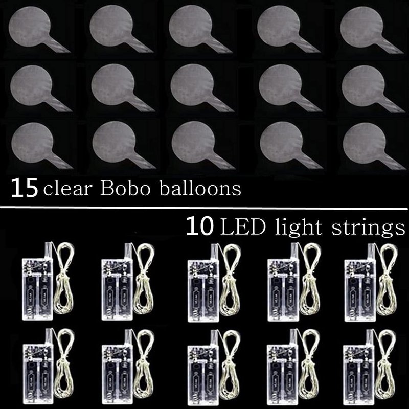 - White LED Balloons 10 sets:10 PCS LED Lights,15 PCS 20 inch Clear Bobo balloons, 48 PCS glue dots, 1 PCS manual. Need two AA batteries for each string lights (Not included in the package)!