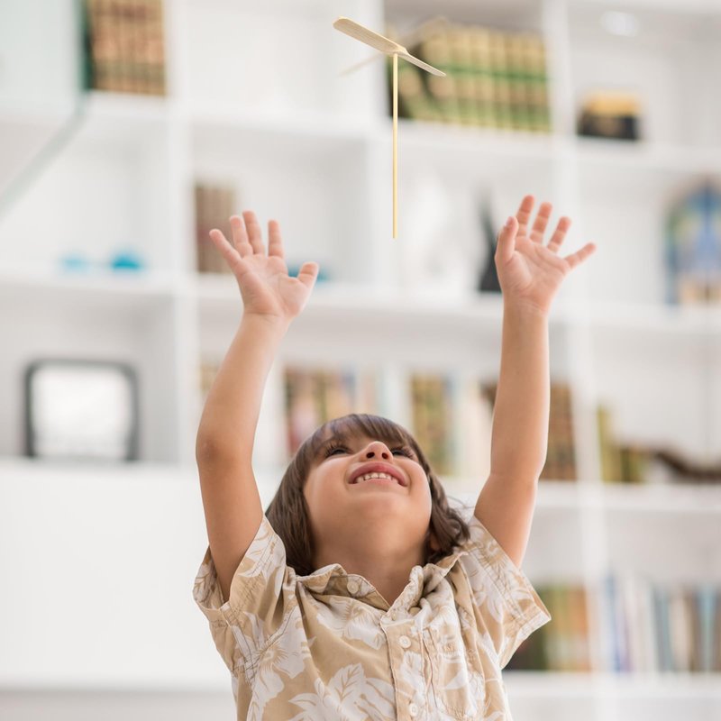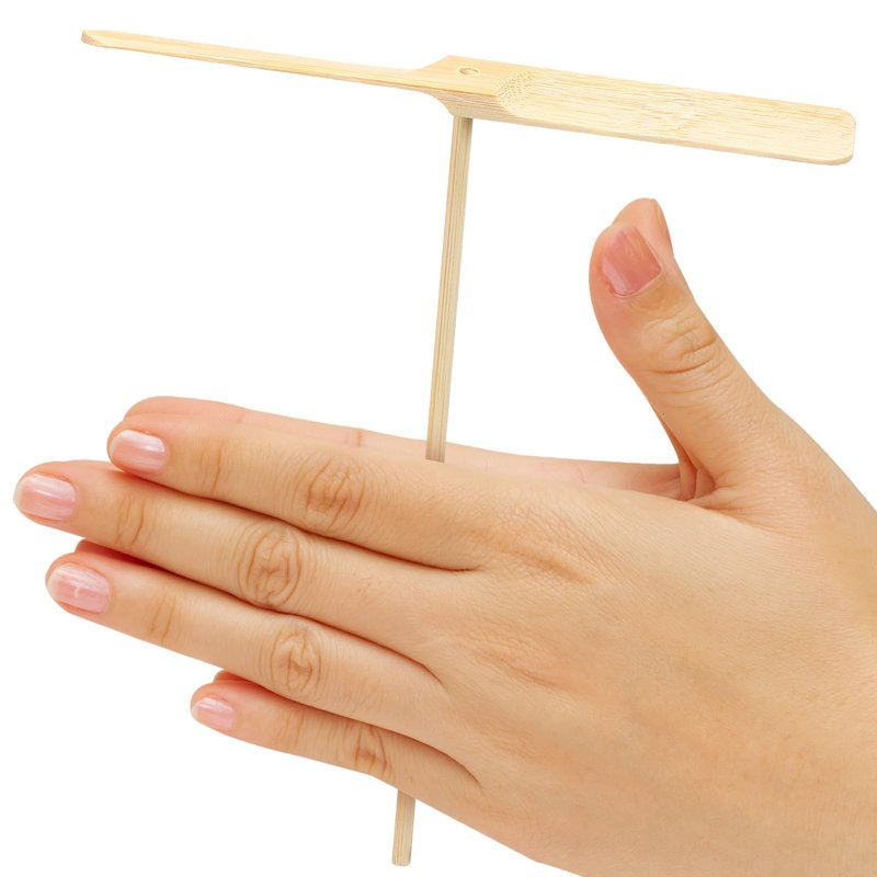 - get the dragonflies soaring to the sky, simply place the dowel between your hands, push your right hand forward while pulling your left hand back slightly, and watch this propeller take off!