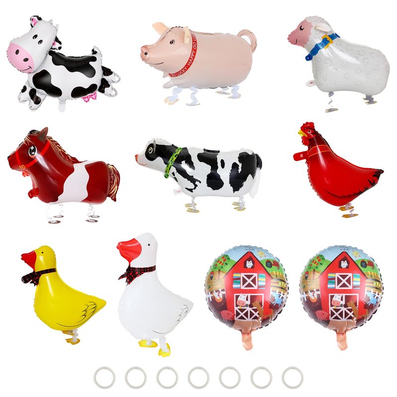 Set Contains: 8 PCS farm animals balloons and 2 PCS round balloons with 7 PCS towing ropes
