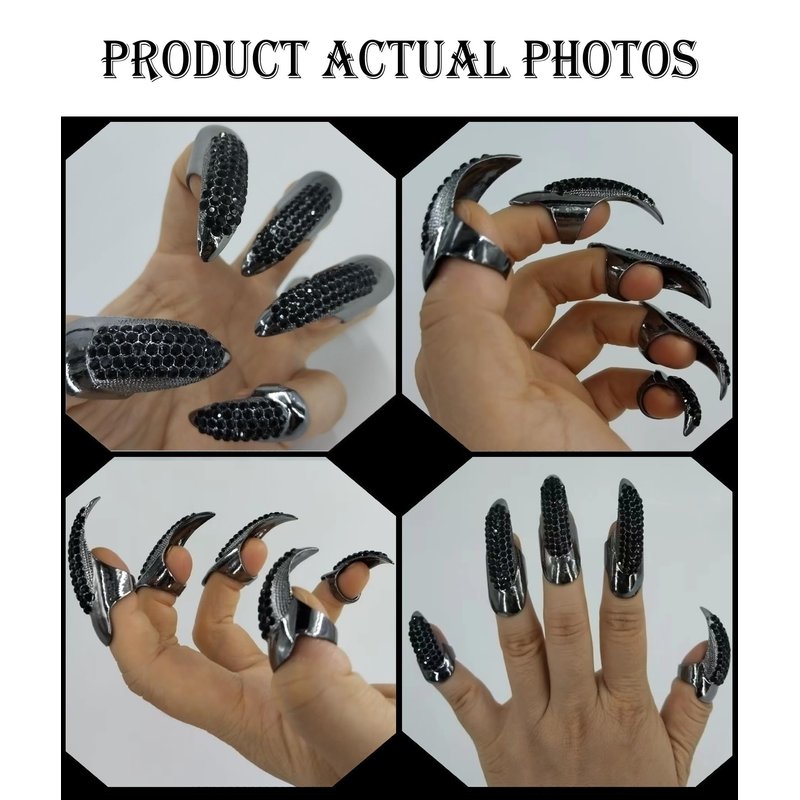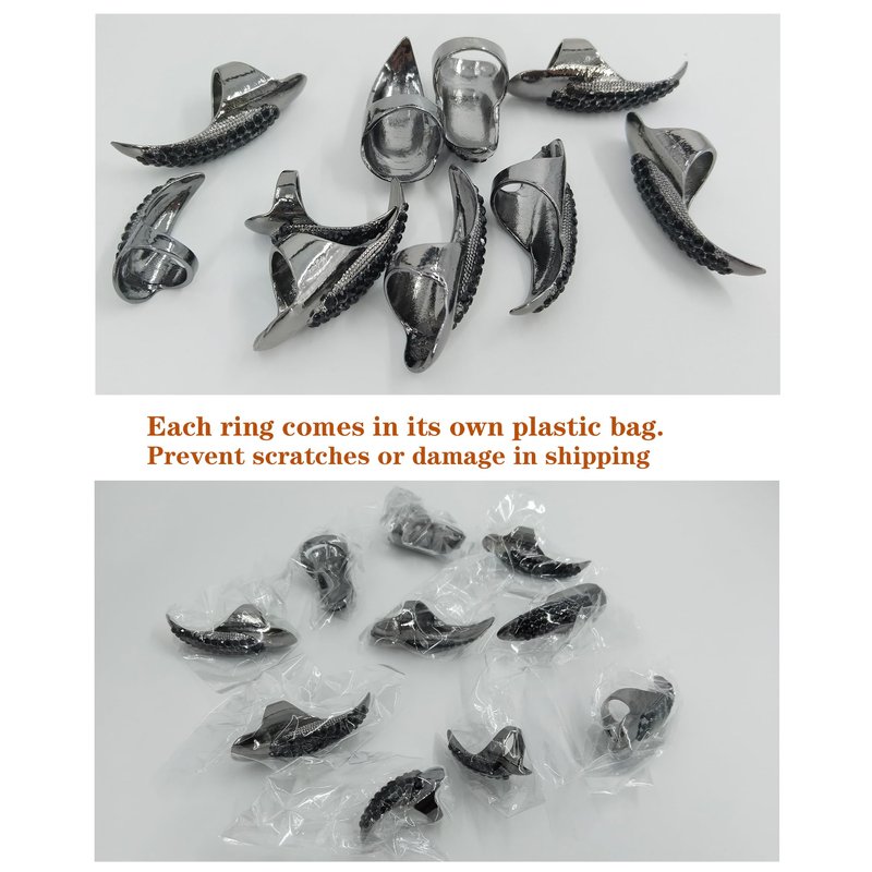 10 Pcs Halloween Costume Claws Fake Nails Ring Set, Bestga Gothic Punk 3 Sizes Crystal Full Finger Rings Paved Paw Bend Fingertip Fingernail Claw Girls Women Men Ring False Easy Long Nails (Black)