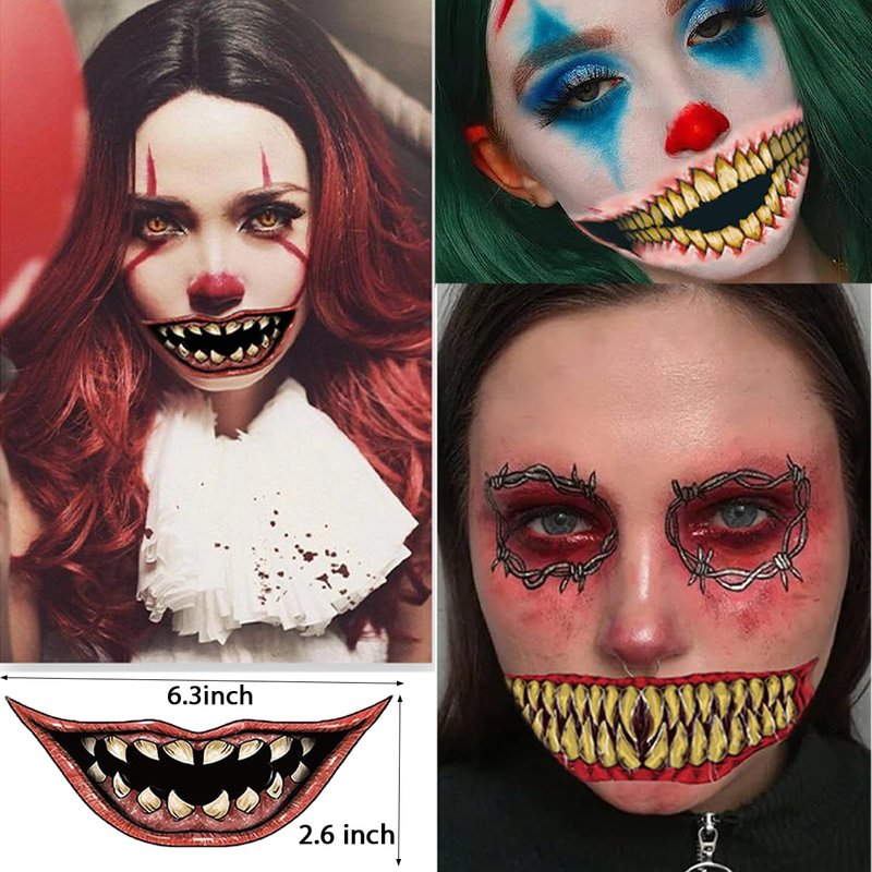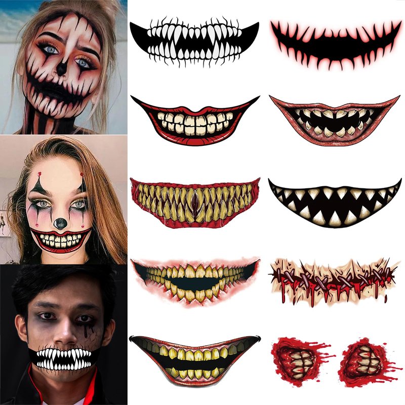 10 PCS Halloween Temporary Tattoo Stickers, Prank Makeup Clown Vampire Horror Mouth Fake Tattoo Stickers, Scary Big Mouth Face Tattoos Decals Kits Prank Props, Halloween Cosplay Party DIY Decorations