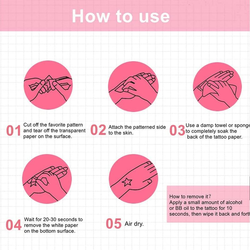 - How to Use : Remove clear film, Apply tattoo on clean dry skin, dab tattoo with damp paper towel, Remove paper, let tattoo dry. It's that simple! Note: The tattoo sticker must not be wet with water in advance, and it must be wet on the body, otherwise the tattoo sticker will not stay on the body for long.
