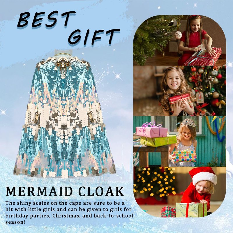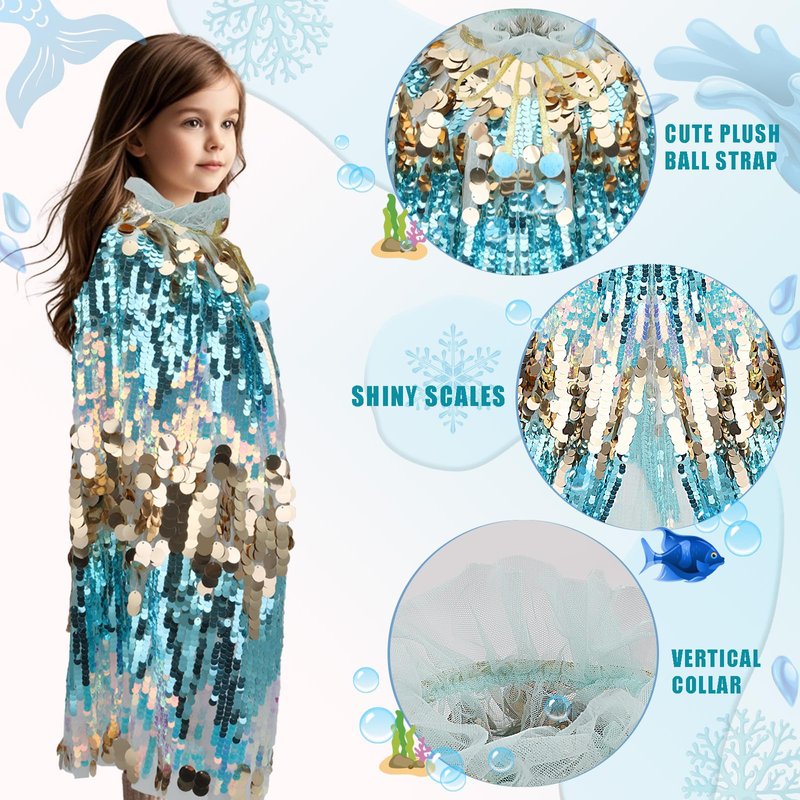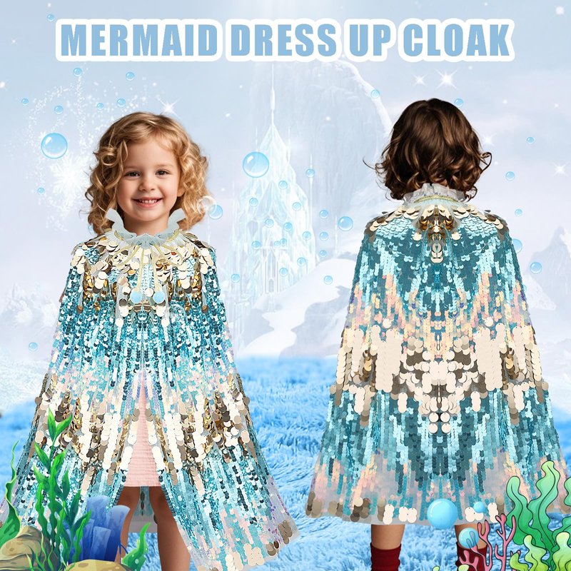 - Sequin Princess Cape:Mermaid sequin costumes for kids has hand-stitched faux sequin mermaid scales. The cape emits different colors of shimmering light when moving, bringing a sense of flow and dynamic effect, unique little mermaid costume cape design looks like underwater fantasy, 5 year old girl gift, add interest and attraction to the little princess! Fashionable princess dress up toys.