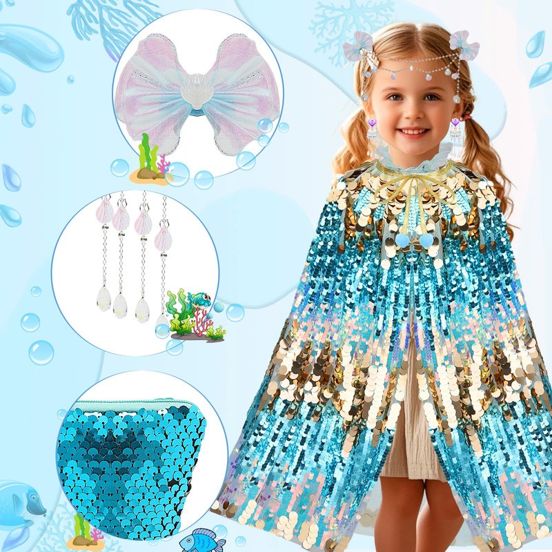 - Mermaid Costume for Girls :A little princess mermaid costume exquisite gift set, princess dress up for girls 4-6. Includes1* little mermaid sequin cape, 2* Gemstone ear clips, 1* bow headbands, 2* Long chain dangling earrings, 1* Pearl necklace, 1* bracelet, 1* ring, 1* Mermaid tail bag, 1* DIY sticker material, 12 PCS pretty princess dress up toys. Princess dress up for 3 year old girls , Meet the girl princess dress up needs.
