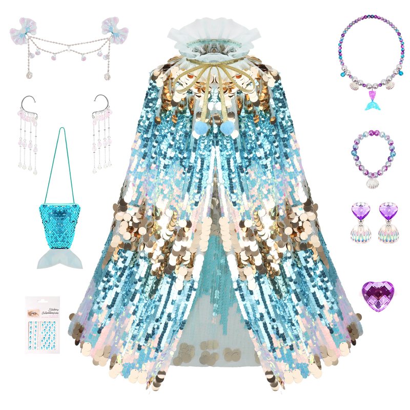 Inspired by the scales of mermaids, the Mermaid Sequin Cloak is made of sequin material that shimmers and shines like the sunlit sea. The cape's silhouette is smooth and fluctuates naturally like the waves of the sea, revealing a unique dynamic aesthetic whether walking or standing still. It is the ideal dress-up costume for little girls to get pleasure and satisfaction in the dress-up process.