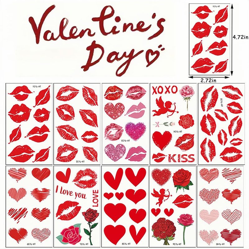 • These Valentine's Day temporary tattoos are full of fun and festive elements, including red lips, roses, cupid, red heart, and slogan. Stick them on your face, arm, neck, back, or any other part of your body to add a splash of joy to your Valentine's Day party!