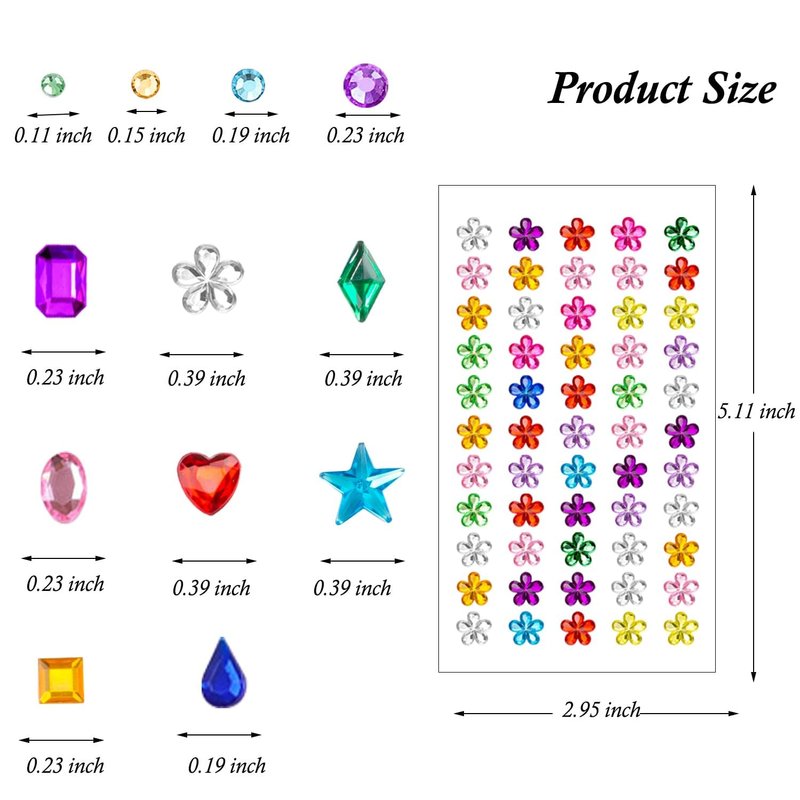 - [ Multiple Sizes and shape] Our rhinestones stickers have nine different shapes: round, oval, diamond, water drop, heart, square, flower, rectangle and pentagram. These circle shaped self-adhesive rhinestones are available in 3mm, 4mm, 5mm, 6mm sizes, and the various sizes are more convenient for you to use in DIY decorations.