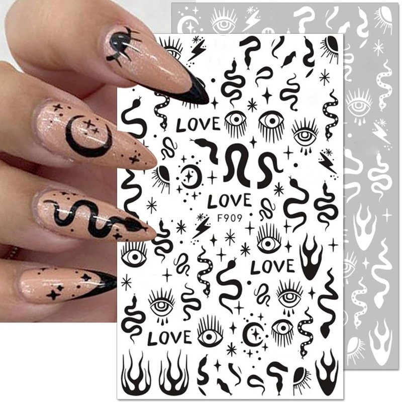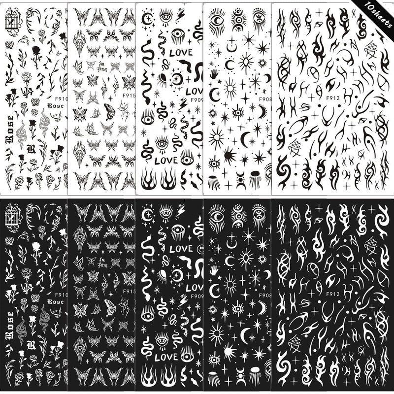 10 Sheets Gothic Nail Stickers 3D Self-Adhesive Snake Nail Art Stickers Black White Rose Flower Eye Fishbone Star Moon Design Nail Art Decorations Butterfly Nail Decals for Women Acrylic Nail Supplies