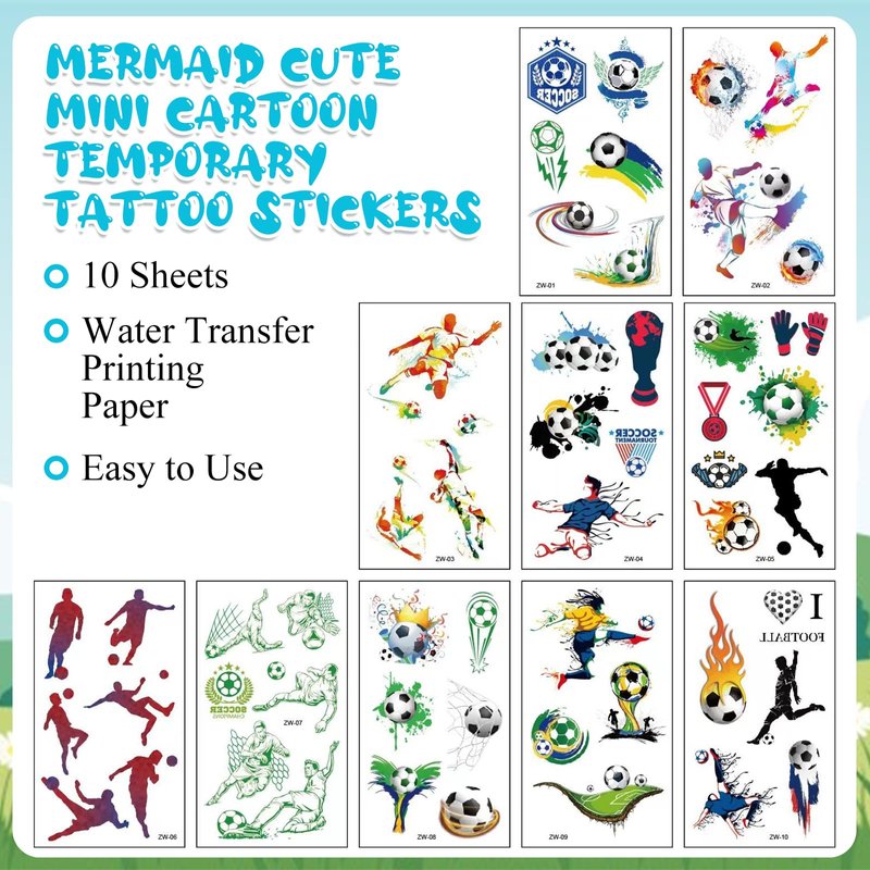 - Products Included : 10 sheets soccer temporary tattoo stickers in different designs. Each sheet measures 4.7in×2.7in(12cm×6.8cm).
