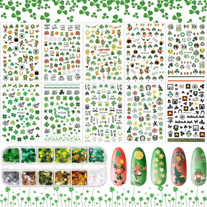 - Nice combination: you will receive 10 sheets St. Patrick's Day nail art stickers, totally more than 700 pieces, and 1 box glitter nail sequins which includes 12 grids, they are well-packed and enough to meet your different needs and for replacement