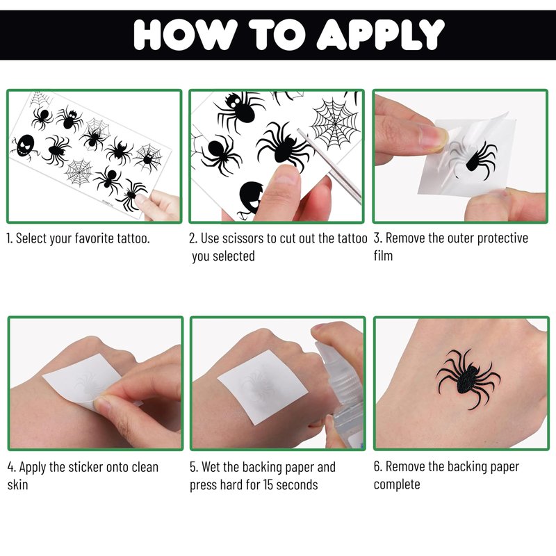 - 🕸️ EASY TO USE AND REMOVE : You can place them on your hands, arms, face, or any comfortable area. Simply cut out each tattoo from the sheets and remove the clear protective layer. Wet the tattoo thoroughly with water, wait for 20-30 seconds, and then remove the backing paper. The result will be a velvety, long-lasting tattoo.