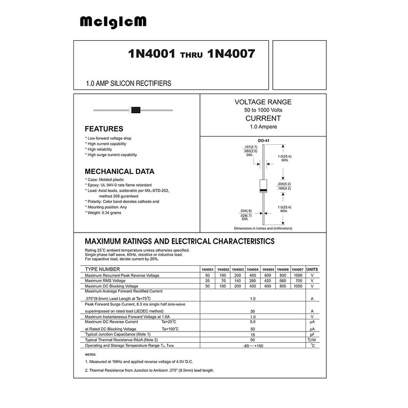 (100 Pcs) McIgIcM 1N4007 Diode, Diode Standard 1000V 1A Through Hole DO-41 1n4007 Rectifier Diode