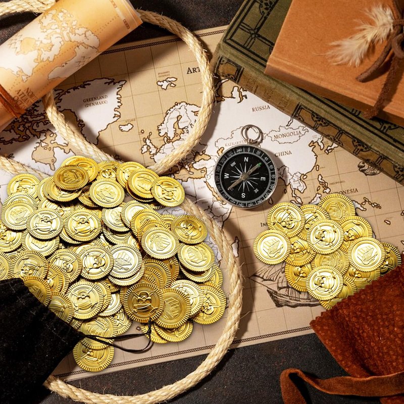 - Pirate Treasure Gold Play Coins - The plastic gold coins are designed with a pirate treasure theme, making them wonderful for pirate-themed parties or treasure hunt games. The coins have a shiny and reflective surface, adding a touch of realism to your pirate treasure.