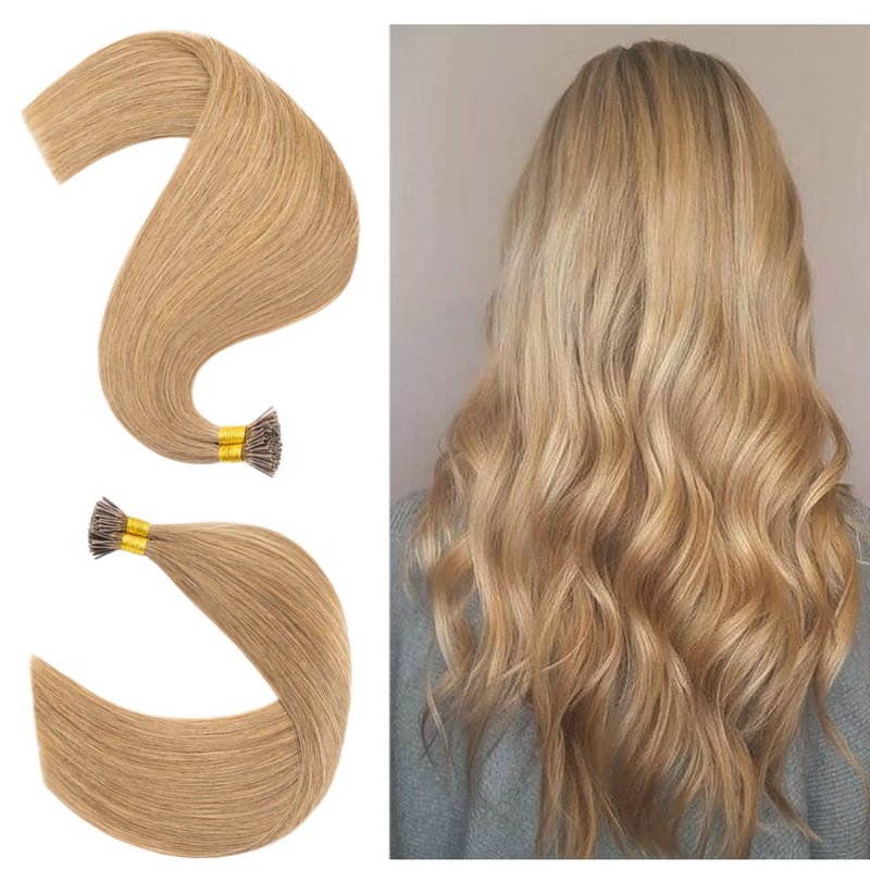 100 Strands/Pack Pre Bonded I Tip Remy Human Hair Extensions Cold Fusion Hair Piece Keratin Stick In Hair Extensions Long Straight For Women 20 Inches #27 Dark Blonde 50g