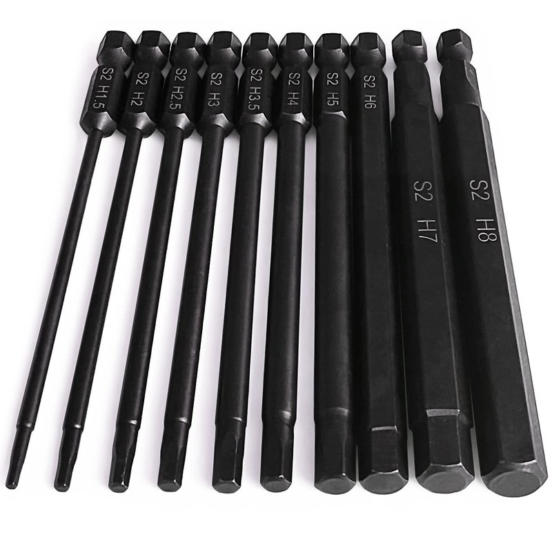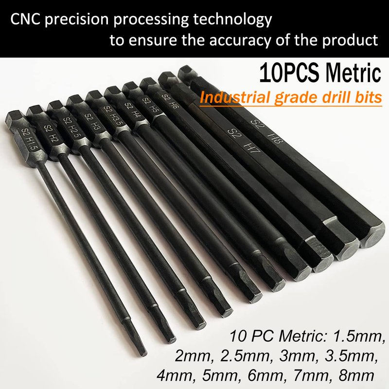 - 100mm long hex bit set: 10 pieces metric of 1.5mm, 2mm, 2.5mm, 3mm, 3.5mm, 4mm, 5mm, 6mm, 7mm, 8 mm, is ideal for a wide range of applications, including DIY projects, automotive repairs, woodworking, and more. This hex key drill bit set provides the versatility you need to tackle any job.