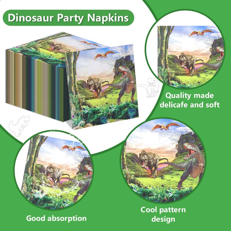 - Dino Party Decor: These adorable disposable napkins feature vivid and realistic dinosaur print that are perfect for kids' parties, baby showers, and dinosaur-themed birthday celebrations.