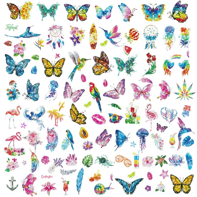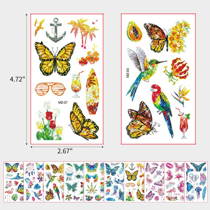 - Glitter Butterfly Temporary Tattoos: 10 sheets of 100pcs different funny butterfly cartoon temporary tattoo sticker Pattern. Lifelike Butterfly Temporary Tattoos Will Bring Fun To Your Life. size:6.8*12cm(2.67"*4.72").