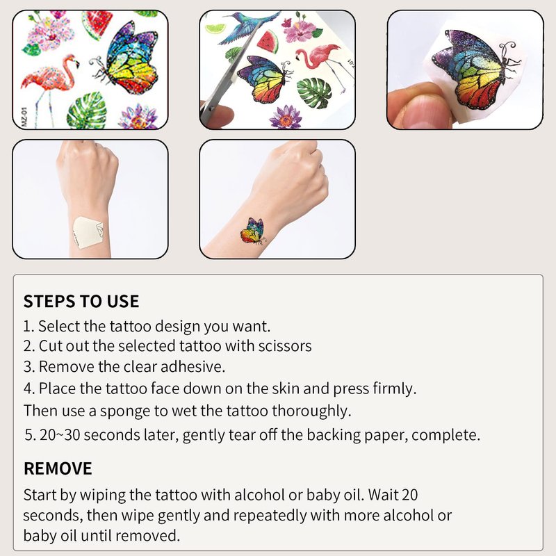 - How to Use: Cut off the desired part of the tattoo, gently tear off a layer of transparent protective film on the temporary tattoo, then paste the pattern surface on the part you want to paste, wet the white paper with water, wait for dozens of seconds, and then Slowly peel off the sticky paper and it's done.
