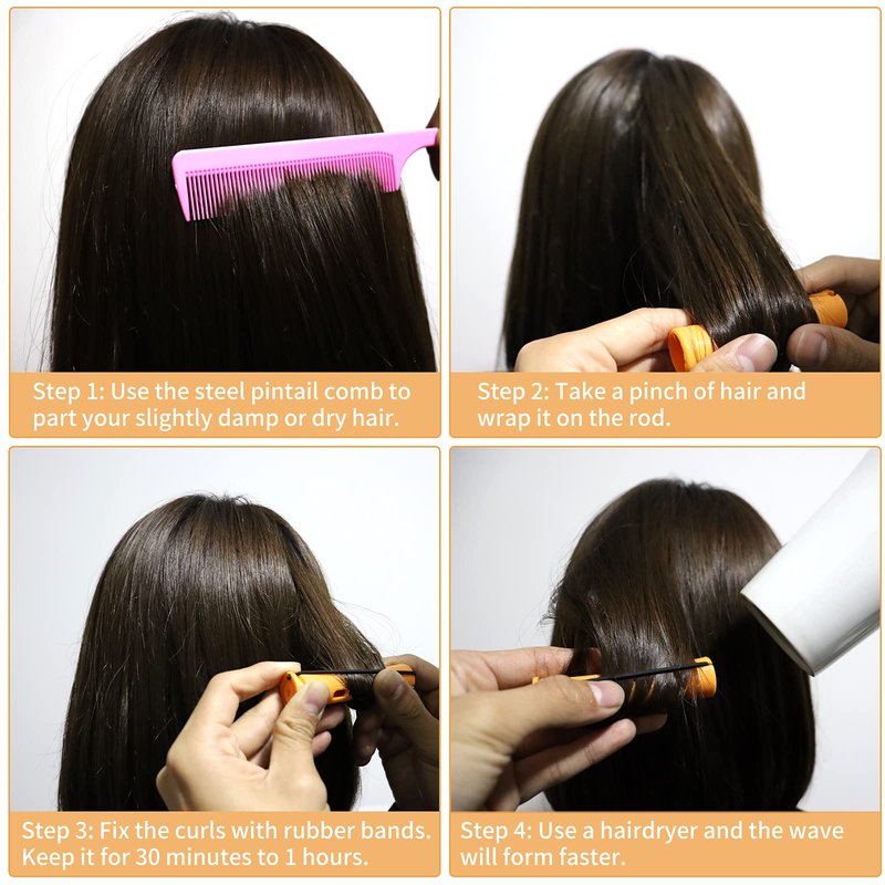 - 【Easy to Use】Just use the steel pintail comb to part your slightly damp or dry hair, take a pinch of hair and wrap it on the rod, then fix the curls with rubber bands, 5 sizes can be used together and wait for a period of time, easily make natural and charming curls as you like.