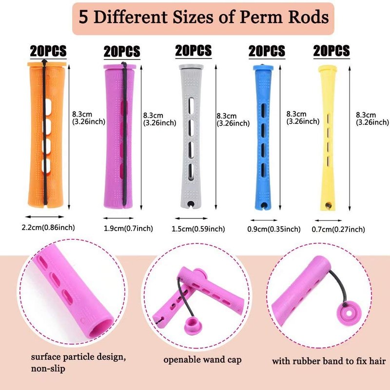 - 🌹【Product Include】: You will receive 100pcs perm rods for hair,(20pcs orange color size: 2.2cmx8.3cm;20pcs purple color size:1.9cmx8.3cm;20pcs gray color size:1.5cmx8.3cm;20pcs blue color size:0.9cmx8.3cm;20pcs yellow color size:0.7cmx8.3cm;) proper size that easy to use and store