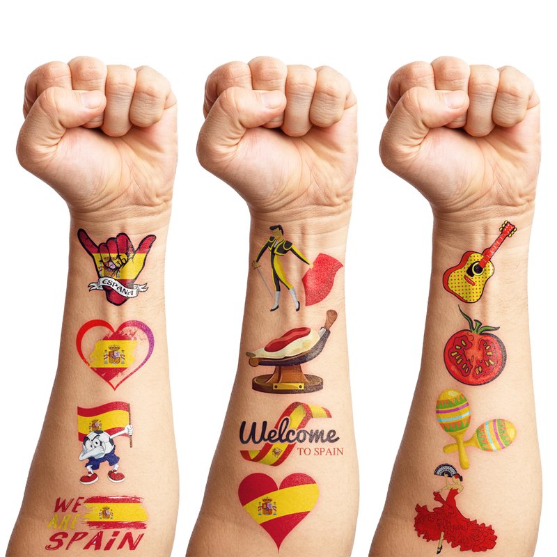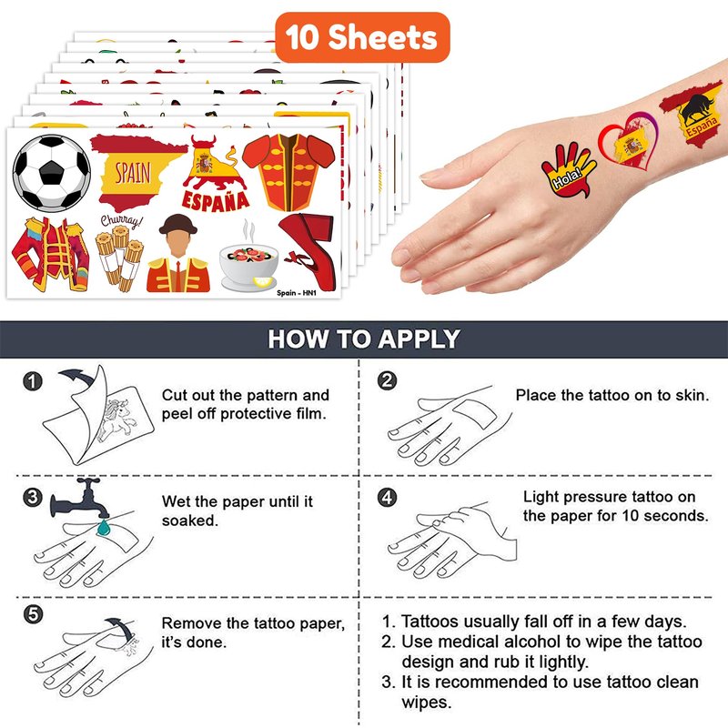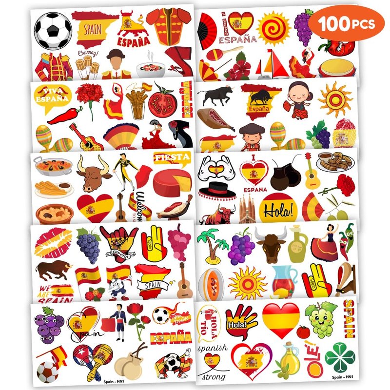 - Pattern rich: Spanish Spain Español Espana Temporary Tattoos for Kids include 10 Sheets 100 PCS, the size of each sheet is 6.1 * 3.1 inches. Having a variety of characteristics, shapes and vibrant colors can stimulate your children's imaginations and bring a creative atmosphere to your Spain Espana Party.