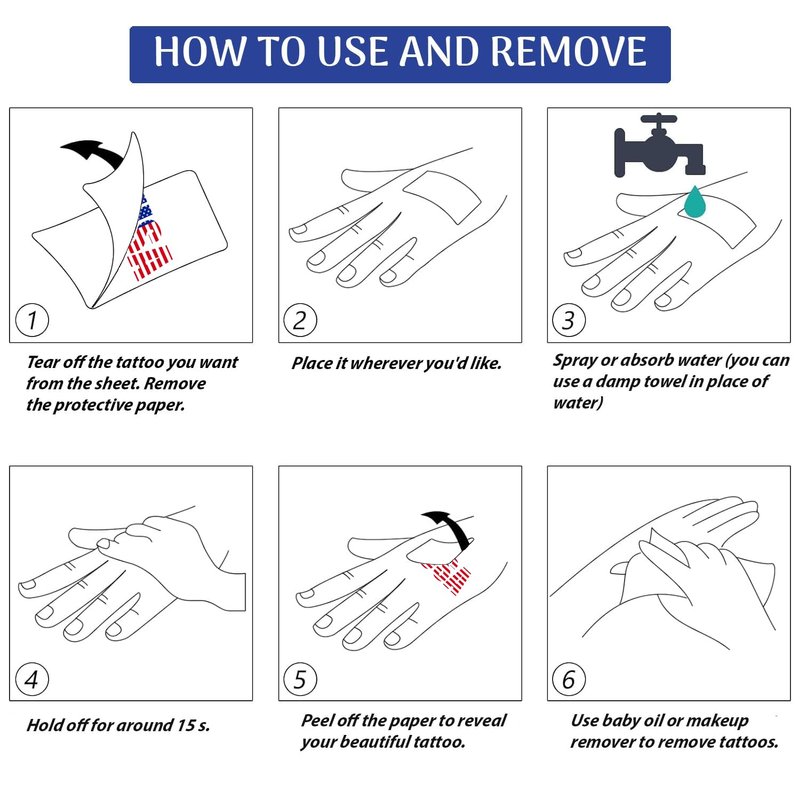 • šŸ’™ EASY TO APPLY: Simply peel off the protective film from the tattoo, place it on clean skin, wet a towel with water, and gently press down twice. Wait 10-20 seconds, then gently peel off the paper to reveal your USA tattoo