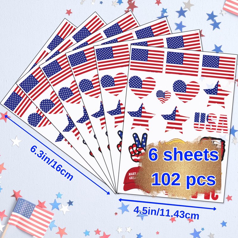 USA FLAG TATTOO SET: Our USA flag tattoo set includes 6 sheets with 102 pieces, perfect for sharing with friends and family. They are suitable for all ages, including children, teens, and adults. Each sheet measures 6.3 x 4.5 inches