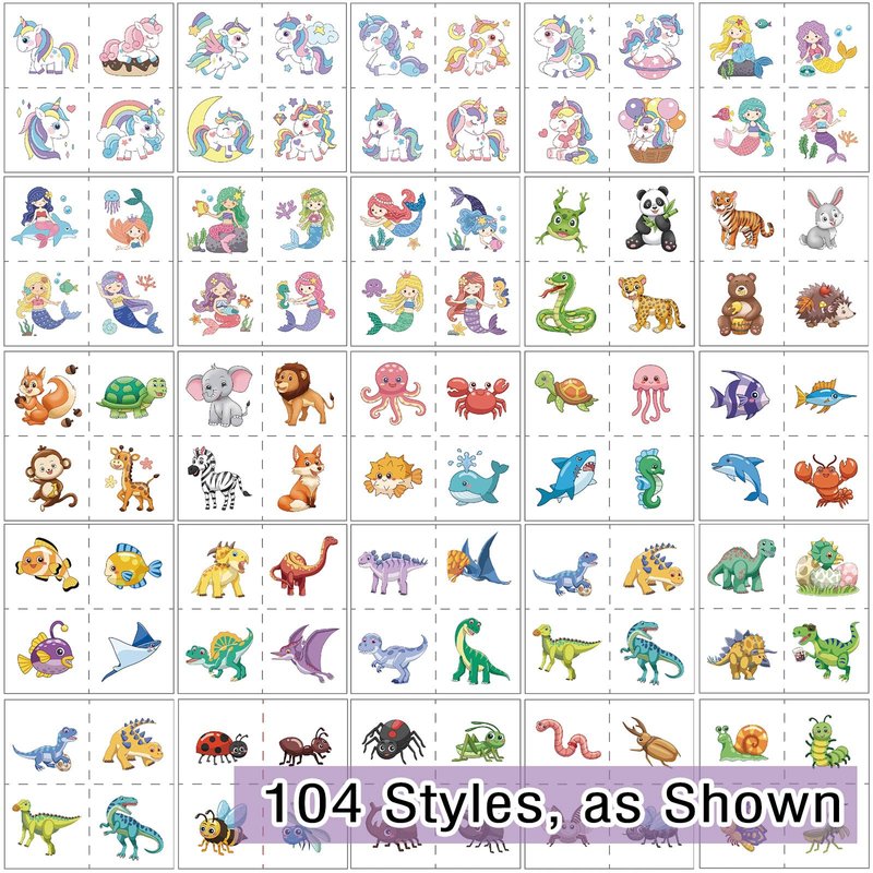 - 【Package Included】104pcs kids temporary tattoos, each pattern measures 1.6 x 1.6 inches. There are assorted tattoos for kids, including unicorns, dinosaur, mermaid, animals, sea animals, insects patterns that will bring endless joy to children and adults alike.