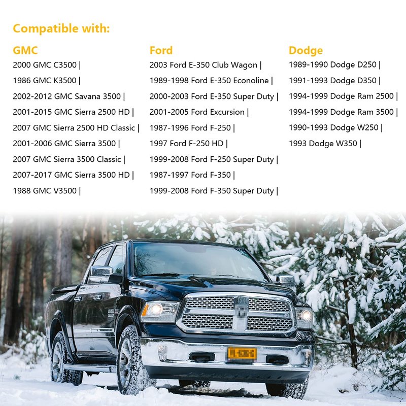 • Compatible with Dodge & Ford: 1989-1990 Dodge D250 | 1991-1993 Dodge D350 | 1994-1999 Dodge Ram 2500 | 1994-1999 Dodge Ram 3500 | 1990-1993 Dodge W250 | 1993 Dodge W350 | 2003 Ford E-350 Club Wagon | 1989-1998 Ford E-350 Econoline | 2000-2003 Ford E-350 Super Duty | 2001-2005 Ford Excursion | 1987-1996 Ford F-250 | 1997 Ford F-250 HD | 1999-2008 Ford F-250 Super Duty | 1987-1997 Ford F-350 | 1999-2008 Ford F-350 Super Duty |