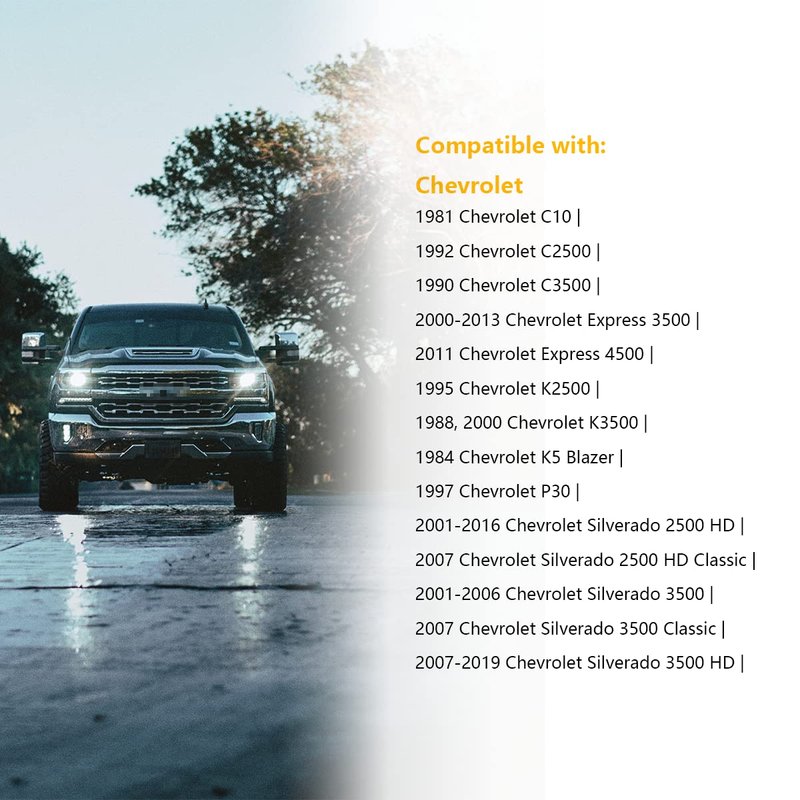 • Compatible with Chevy: 1981 Chevrolet C10 | 1992 Chevrolet C2500 | 1990 Chevrolet C3500 | 2000-2013 Chevrolet Express 3500 | 2011 Chevrolet Express 4500 | 1995 Chevrolet K2500 | 1988, 2000 Chevrolet K3500 | 1984 Chevrolet K5 Blazer | 1997 Chevrolet P30 | 2001-2016 Chevrolet Silverado 2500 HD | 2007 Chevrolet Silverado 2500 HD Classic | 2001-2006 Chevrolet Silverado 3500 | 2007 Chevrolet Silverado 3500 Classic | 2007-2019 Chevrolet Silverado 3500 HD |