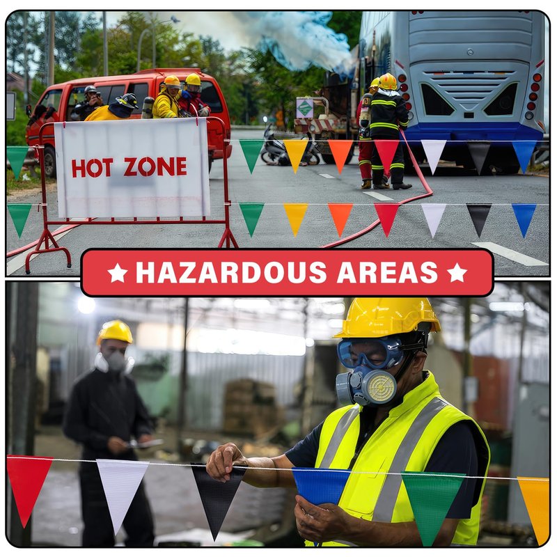 - Versatile Applications: These warning flags include 45 pennants, measuring 7''x10'' and 105 ft in total. From ensuring safety on construction sites/off-limit areas to controlling traffic/parking, enhancing party aesthetics, marking special places, or for utility and roofing projects, their adaptability makes them a go-to solution for various occasions