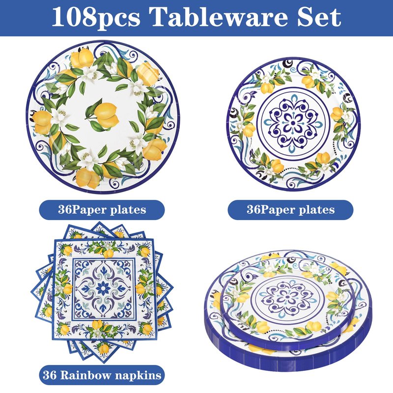 - Package Includes:You will receive 108 pcs lemon party supplies tableware set including 36 pcs 8.8 inches lemon paper plates, 6.8 pcs 7 inches capri lemon party decor summer plates, 36 pcs amalfi coast party decor napkins for 36 guests per set. This lemon party decor tableware set will amaze you, your family and friends