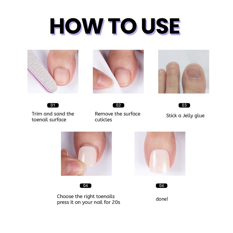 - Easy To Use:Clean and polish your nails, choose a suitable size french fake toenails, apply jelly glue, and then press on the nail for 30 seconds.no need to buy extra material to have get an acrylic press on toenail. The fake toenails will stay longer if you clean your nails before use,and avoid water within the first hour of wearing
