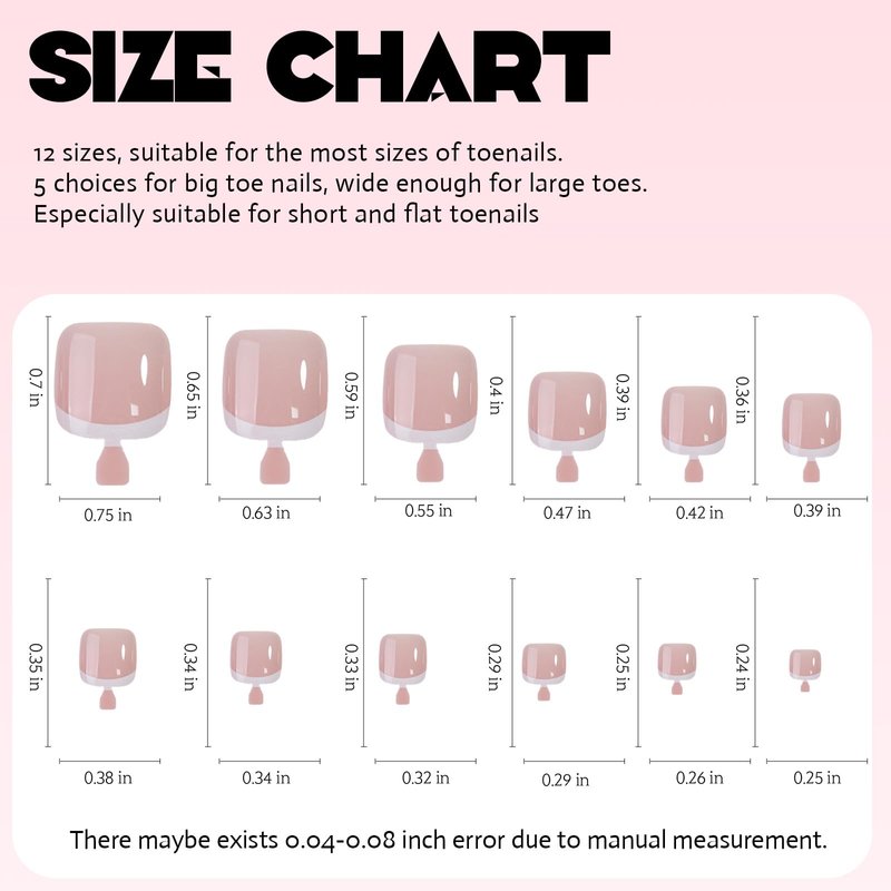 - Exquisite Design:the cute press on toenail with perfect toenail nails shaped, the top of are thicker design, bottom has a lighter edge and slight curve. it is can fits perfectly on your real nails. And the french nails are light and soft, It doesn't feel tight after wearing and doesn't burden our nail beds