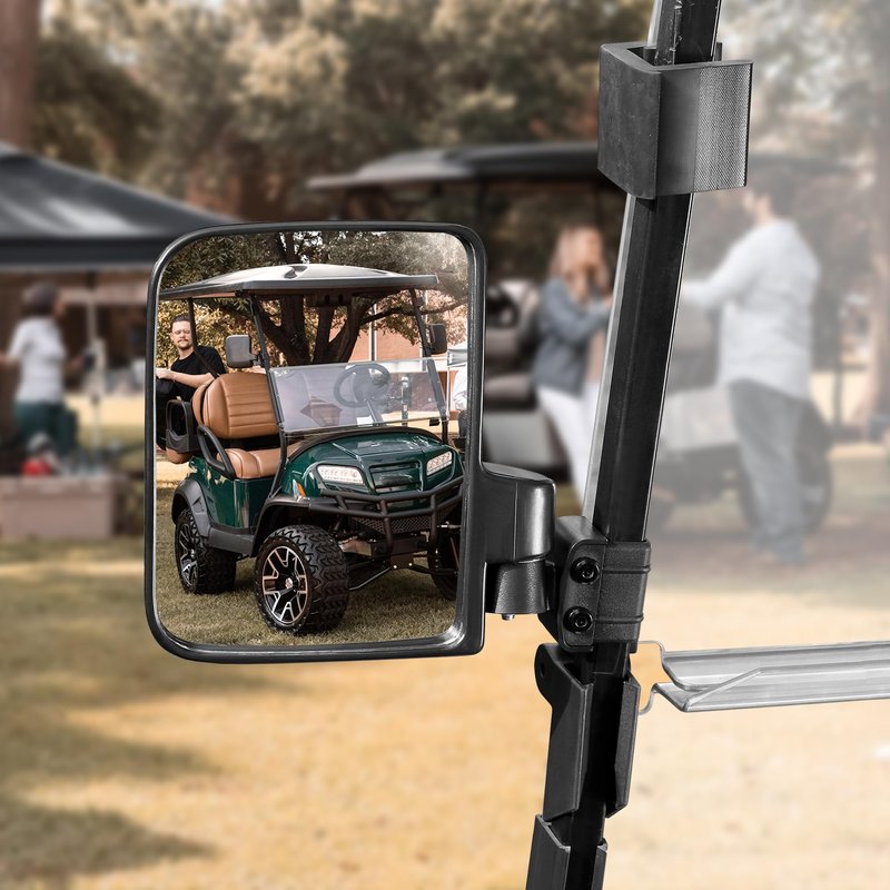 - 180 degree fully adjustable golf cart side mirror set, easy to adjust front & back for the desired visual angle. And foldable when meeting obstacles to prevent breaking.