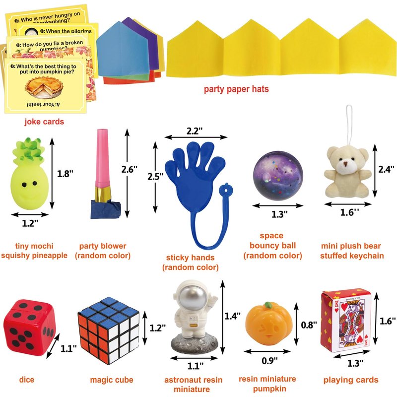 - 10 PCS different toys prefilled, such as playing cards, resin miniature pumpkin, space bouncy ball (random color), magic cube, dice, astronaut resin miniature, tiny mochi squishy pineapple,mini plastic party blower, mini plush bear stuffed keychain, sticky hands(random color)