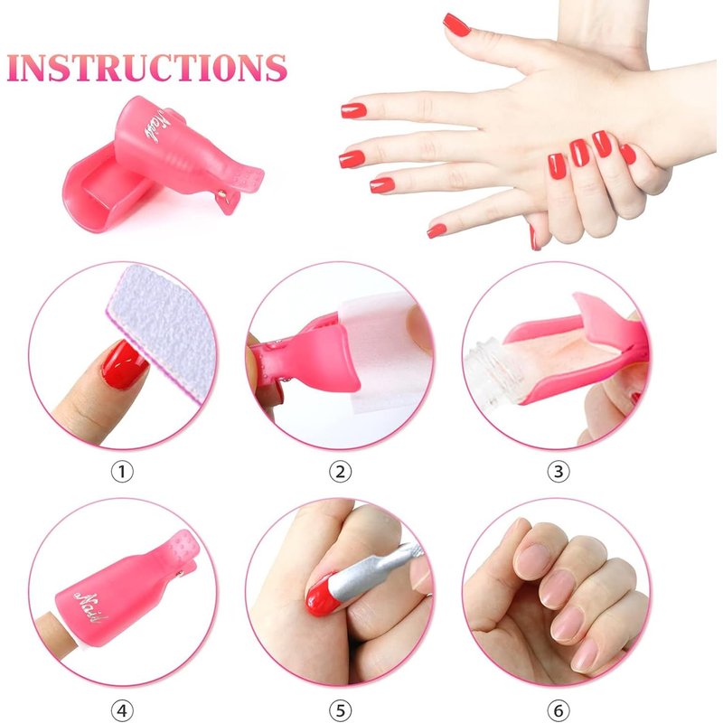 - Nail Polish Remover Clips:They are easy to operate and quickly remove nail polishes, UV gel etc.Sleek nail remover clips with anti-slip design can provide enough pressure to make these clips stay on your nails but not hurt your nail bed.