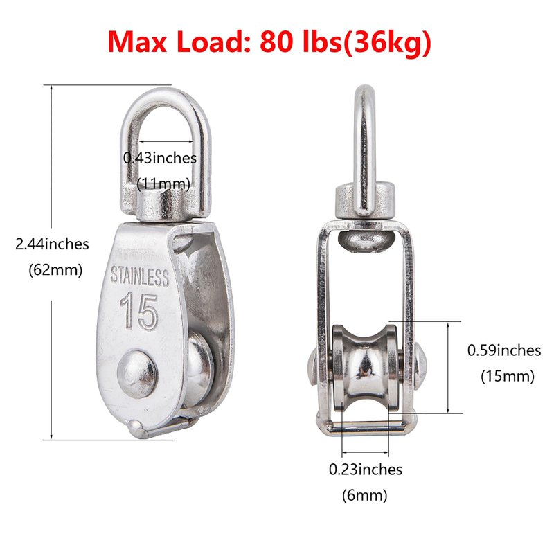 - ▶Dimension◀: M15 Single Pulley Size: Length: 2.44in(62mm), Width: 0.83in(21mm), Max Load: 80 lbs(36kg). Spring Snap Hook: Max Load: 119 lbs(54kg).