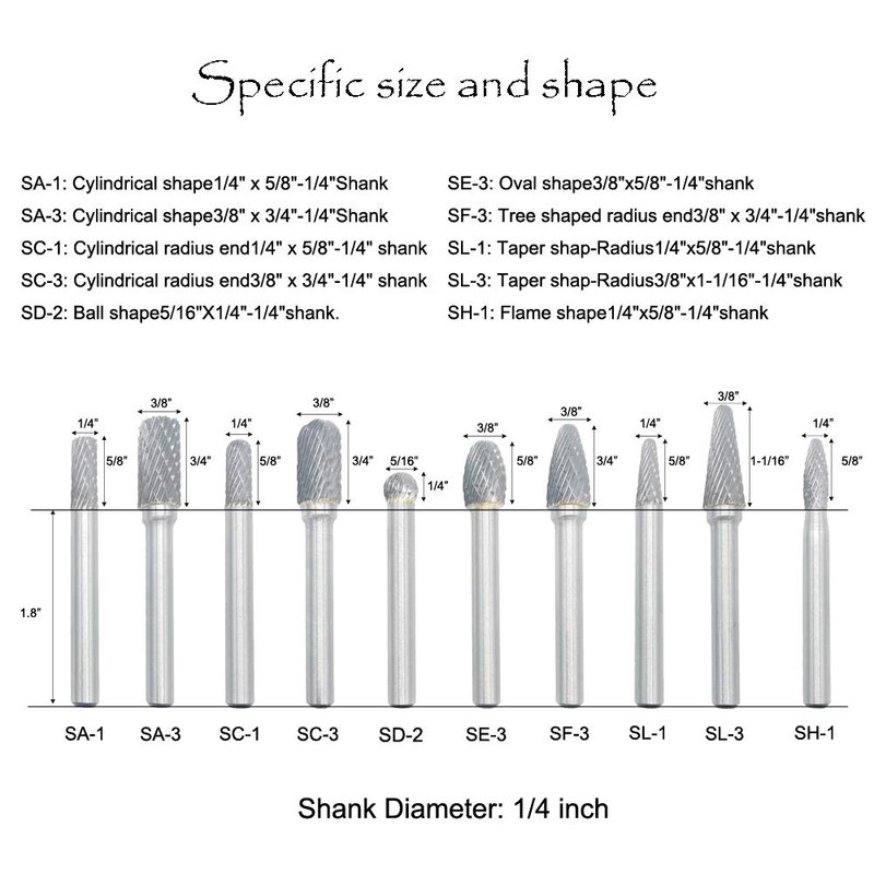 - 【INCLUDE】Our tungsten carbide burr set included | Cylinder shape, Ball shape, Oval shape, Tree shape radius end, Flame shape, Cylindricalradius end, Taper shape-Radius.