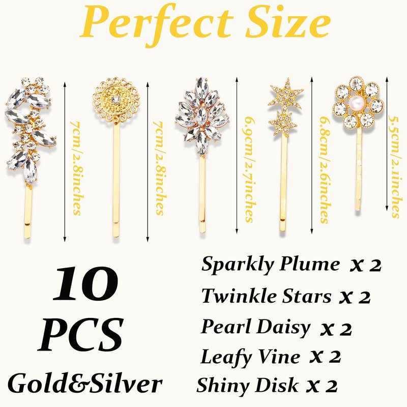 - 【Package Includes】 You will receive 10 alloy hairpins, including 2x Sparkly Plume, 2x Leafy Vine, 2x Twinkle Stars, 2x Pearl Daisy, 2x Shiny Disk. Two different styles of gold and silver, one pair for each style in good packaging. Therefore, you have enough quantity and colors to choose from to help you match according to your daily clothes and makeup.